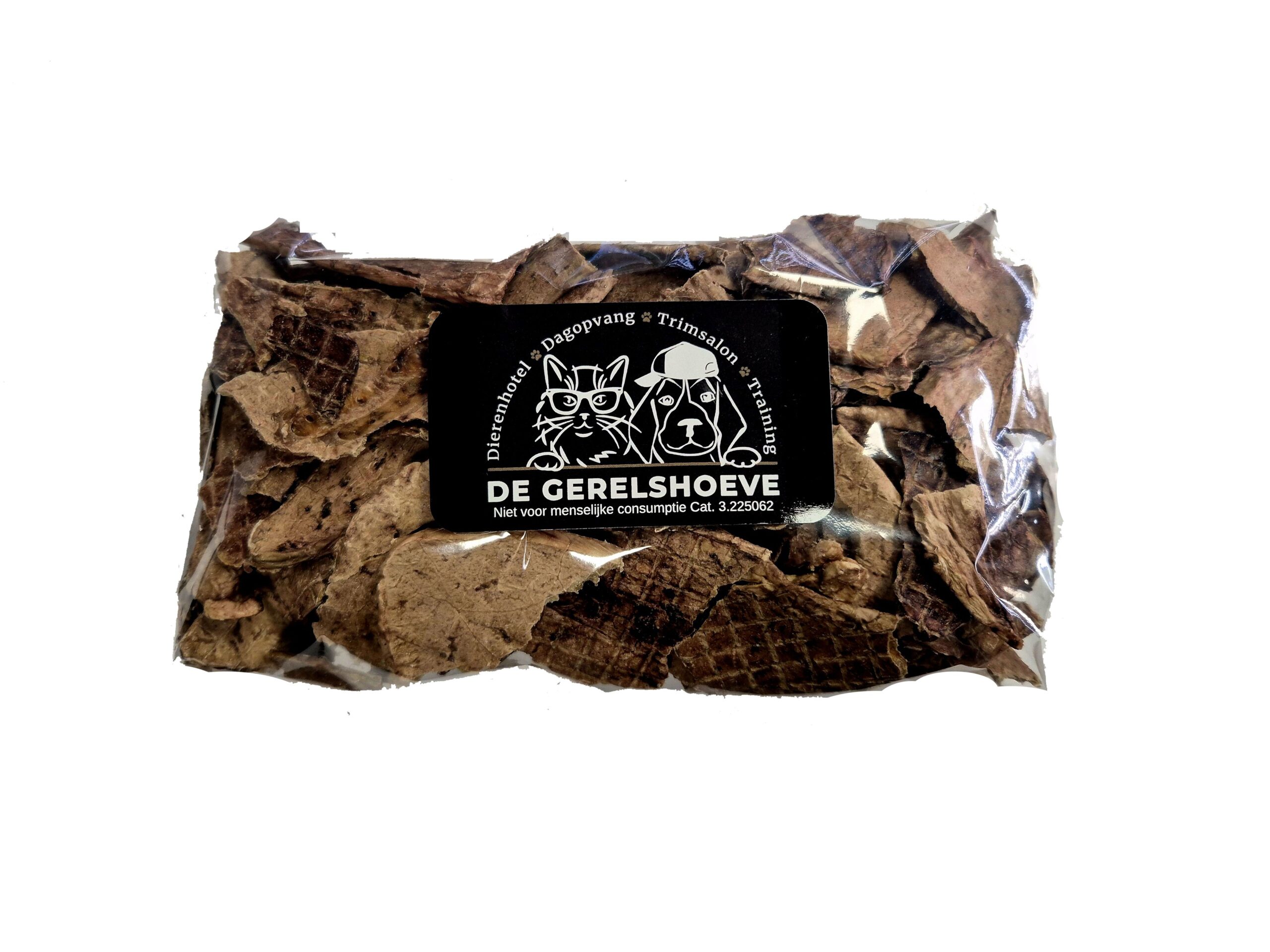 Bestaat uit 100% magere, vetvrije runderlong. Deze natuurlijke snack is rijk aan eiwitten en bevat geen kleur-, geur- of smaakstoffen en geen conserveringsmiddelen. Dankzij de lichte structuur en pure samenstelling zijn de snacks geschikt voor alle hondenrassen en ideaal als beloning of tussendoortje. 150 gram.
